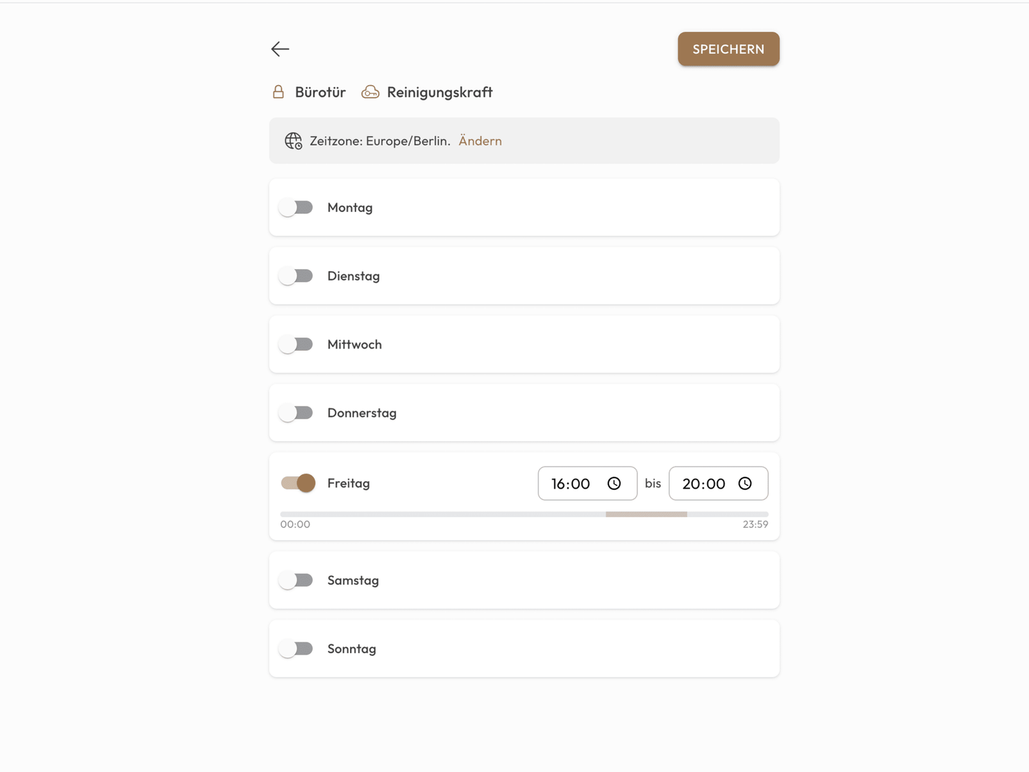 Gültigkeits-Zeiträume können ganz genau bestimmt werden, so dass Mitarbeitende nur unter der Woche Zutritt haben oder dass die Reinigungskraft nur Freitag Abend in das Gebäude kann.